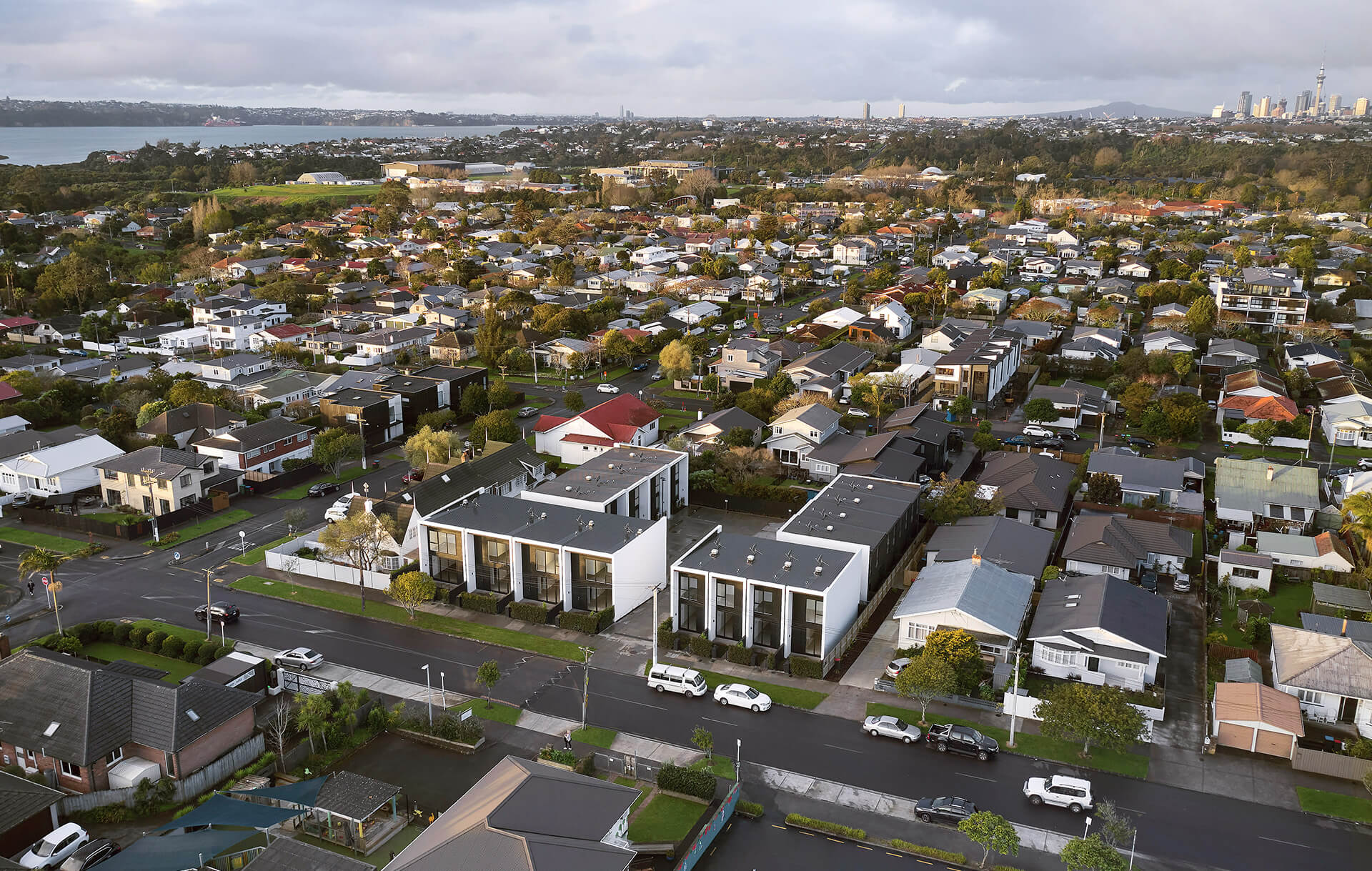 These sixteen town houses built in Point Chevalier made use of brick and Luna wood cladding to create a natural, contemporary finish that complemented the surrounding area.